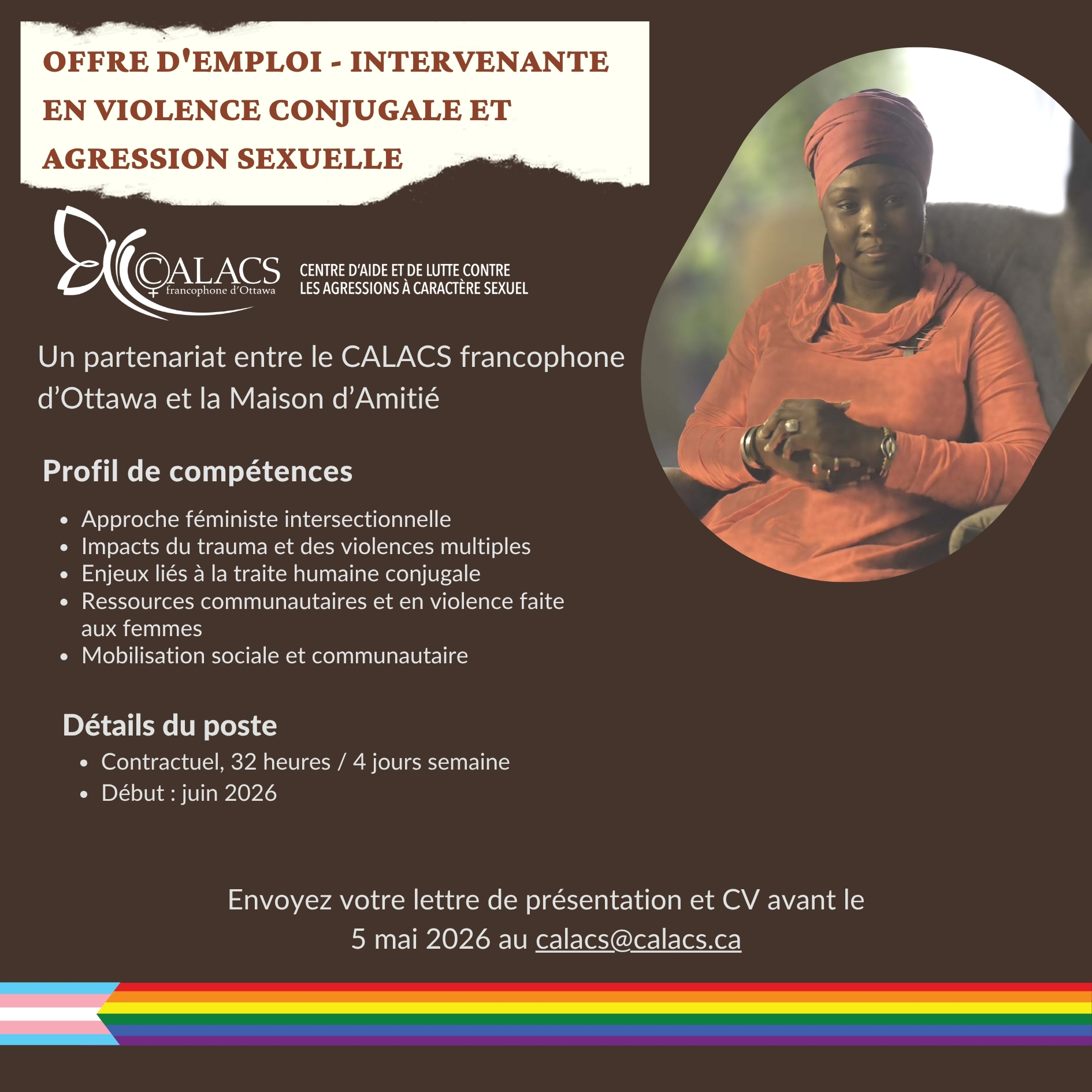 L’intervenante offre des services d’intervention spécialisée auprès des survivantes d’agressions sexuelles vivant également des situations de violence conjugale. Elle assure du soutien individuel et de groupe, de l’accompagnement, ainsi que des activités de prévention, de sensibilisation et de militantisme, en collaboration avec la Maison d’Amitié (MA) et le CALACS francophone d’Ottawa.
